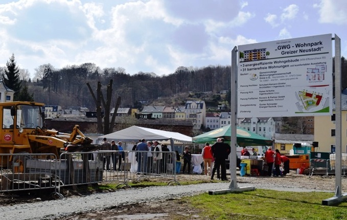 Nach langer Vorbereitungszeit war es soweit. Im Beisein vieler zukünftiger Mieter des GWG-Wohnparks in der Greizer Neustadt, Vertreter der Stadtverwaltung, der Genossenschaft, des Ingenieurbüros und vielen mehr, erfolgte am 10.04.2015 der offizielle Spatenstich.