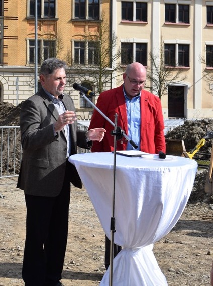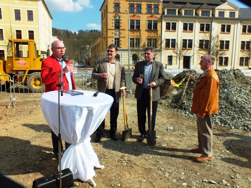 Der Bürgermeister der Stadt Greiz, Gerd Grüner, machte zunächst Ausführungen, was sich auf dem Baugrundstück in der Vergangenheit abspielte. Er konnte seine Freude nicht verbergen, dass diese große Baulücke nun einer ansprechenden und dauerhaften Bebauung zugeführt werden konnte.
